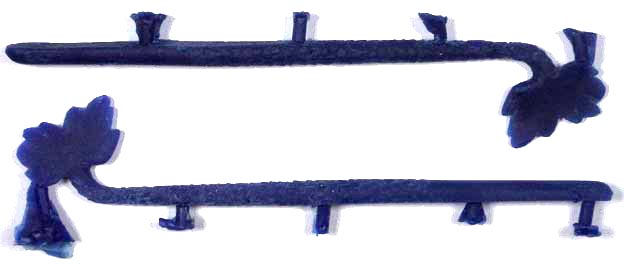The first-stage wax mouldings that were made directly from the extended wooden model. The spigots left from the casting process were cut off and one moulding was made shorter than the other so that the final lever would reach only to the near register. A recess was made at the end away from the tail in order that the lever could pass over the wrestplank moulding and the slightly-raised registers. The wax mouldings were then heated slightly using only body heat and bent asymmetrically to serve as the left- and right-hand levers and to give them a more rhythmical, 'natural' appearance like that of a real mermaid! Wax pins were added to the underside of the distal end of the levers to form spigots which would eventually engage in the registers. This then gave two wax models, one for the left-hand and one for the right-hand side of the instrument, to engage the jacks plucking the long and the short 8' strings respectively.