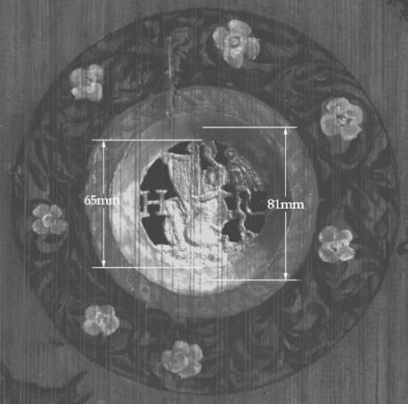 Figure 2 — Photograph of the soundboard rosette showing the outer diameter of the original bevelled rose hole (81mm) compared with the diameter of the Ioannes Ruckers rosette (65mm) placed inside this larger hole.