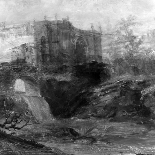 There appears to be an underlying painting below the paint visible near the middle of the photograph above, and this underlying painting seems to occupy only the area above and to the right of the central bridge and tree stump. The area where the underpainting can be seen is compared in the two photographs below: the left photograph is taken with infrared light, whereas the photograph on the right is taken under normal lighting conditions. The 'ghost' image can be seen to be a Triumphal Gate, positioned strangely near the path crossing the bridge, and almost on top of the bridge and waterfall. Unfortunately there now seems to be no way of dating the painting of the Triumphal Gate, and therefore of attributing it. The date of this 'underpainting' in unknown, and it is not known if it is only a pentimento that was painted over by Le Prince.