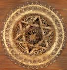Drawings were made by Grant O'Brien based on this design to give a second new rosette design to be used in some of the new 5-octave instruments. The model followed is of the usual deep, 'wedding cake' style of rosette in several layers separated by paper spacers characteristic of the rosettes in many Neapolitan instruments. Each of the top four levels has four layers: a top layer of thin wood, below this a layer of parchment, a second layer of thin wood and at the bottom a layers of gilt parchment. The wood layer is represented in these drawings by a tan colour. The top level (on the left below) is glued to the top of the soundboard and the other three layers are all located below the soundboard and separated from one another by paper spacers. Not shown is a large circular parchment 'tree' at the centre of the bottom level and six small parchment 'trees' fixed to the interior apices of the main star polygon that forms level two.