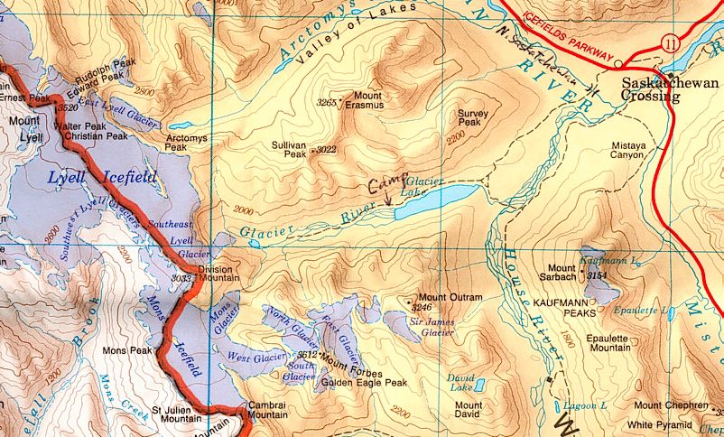 Trip to the Rocky Mountains in 2002 / 00 Glacier Lake mapThis map shows Glacier Lake with our camp location shown in the centre of the map. The walk began just to the west of Saskatchewan River Crossing. From camp we walked up Glacier River to the tongue of the Lyell Glacier shown at the centre left. |