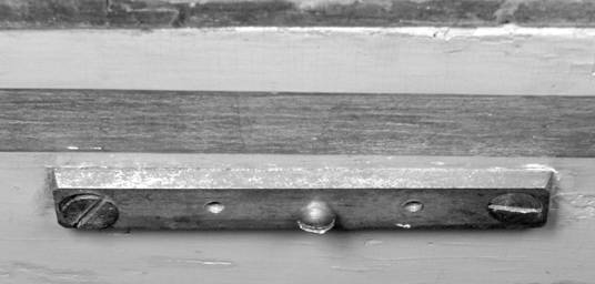 Figure below shows a plan view of the register-regulation plate removed from the instrument. Unfortunately 2 of the 3 machine-screw bolts are now missing and the wood screw at the left-hand end of the plate is a replacement 19th-century screw, probably dating from the restoration of the instrument by Tomasini in Paris in 1882. The presence of an original eighteenth-century screw (on the right in Figure 2 above and Figure 3 below), leads me to believe that the plate and the system of regulation it provides is original to the instrument.
