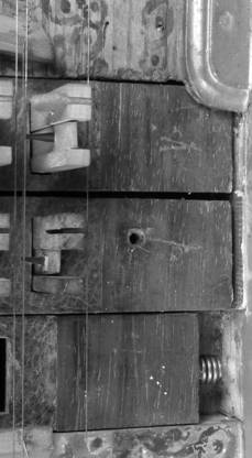 The treble ends of all three of the registers in the 1769 Taskin double-manual harpsichord can be seen in Figure 5 above. The register lever plate had been temporarily removed when this photograph was taken, and the spring can be seen expanded to its full extent. Here the screw hole in the 4' register for the 4' register lever can be seen in the middle register (the rear 8' register is operated by a register lever on the bass side of the instrument). When the regulation plate is screwed in position the spring at the treble end of the upper-manual register is compressed leaving about only 1mm of spring exposed and 1mm of space between the end of the upper-manual register and the inside surface of the cheek.