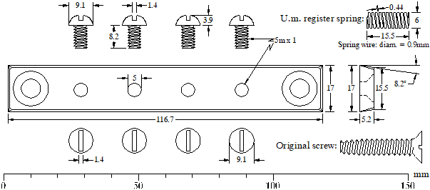 Figure 3 - Plan view of the spine registers regulation plate with two wood screws. Scale 1:1.