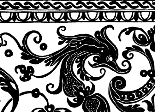 O'Brien Type 3 - The white dolphin pattern Perhaps the most famous of the Flemish block-printed paper patterns. This is used for the front and keywell of Flemish virginals, but is also suitable for single-manual harpsichords although, used there, some of the pattern needs to be cut away. It is not really suitable for double-manual harpsichords since then most of the pattern needs to be cut away because of the space occupied by the upper manual. Dimensions: 361mm long x 131-177mm wide |